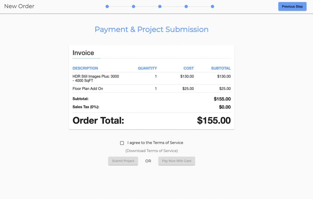 When you are ready to proceed, click on the "I agree to the Terms of Service" box, then click on "Submit Project, or "Pay Now With Card" butto
