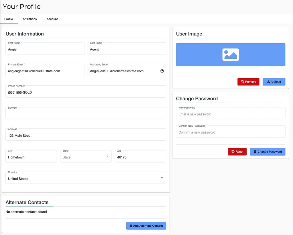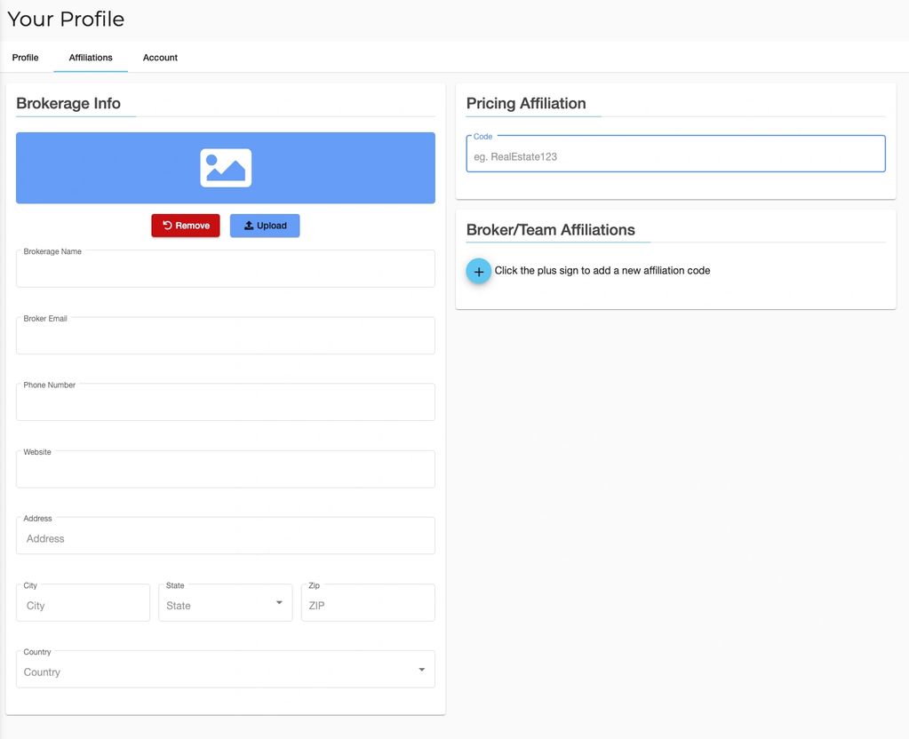 Click on the "Affiliations" button to edit your Broker Information and the Banner displayed on your landing page.